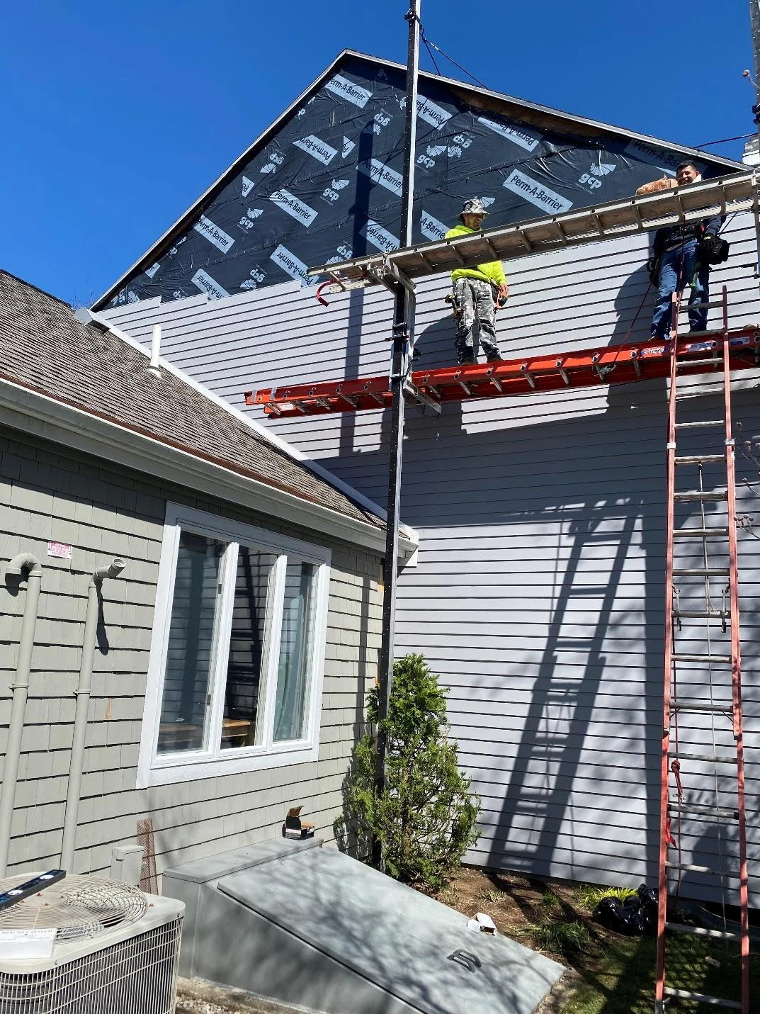 At the rear elevation, existing siding was removed and disposed of, followed by removal of the original water-resistive barrier. A liquid-applied air and vapor barrier (AVB) was installed to improve moisture and air control performance. New Everlast composite siding was then installed, with final color selections coordinated with the Owner, delivering a durable, low-maintenance exterior solution.